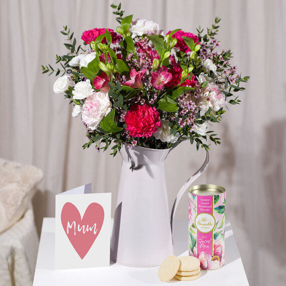 Celebrate mum with this charming Mother’s Day gift set. Featuring a radiant bouquet bursting with pink and white blooms, paired with a tube of ‘Special Mum’ shortbread biscuits.