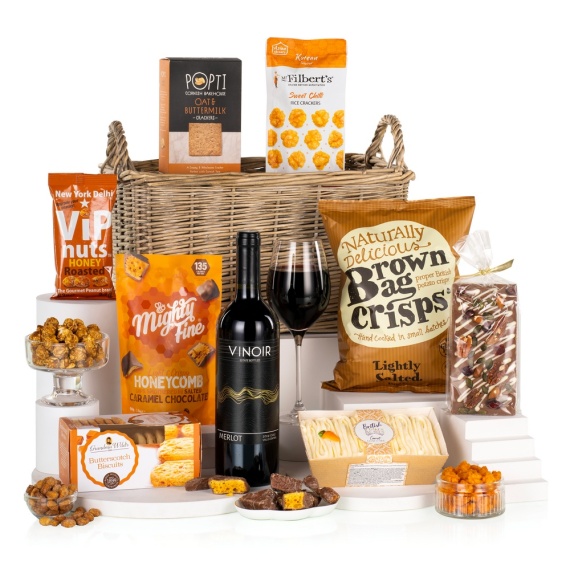 Elegant and indulgent, The Luxury is a show-stopping hamper filled with fine food and wine. Featuring Vinoir Merlot, savoury nibbles, biscuits, cake, chocolate and honeycomb, it’s beautifully presented in a greywash willow basket, the perfect gift for any special occasion. This hamper contains 9 items: British Bakes & Cakes Carrot Loaf Cake 290g Brown Bag Crisps Lightly Salted Crisps 150g Grandma Wild’s Butterscotch Biscuits 150g Mighty Fine Salted Caramel Honeycomb Dips 90g Mr Filbert’s Sweet Chilli Rice Crackers 40g New York Delhi ViP Nuts Honey Roasted Peanuts 63g Popti Cornish Bakehouse Oat & Buttermilk Crackers 120g Stas Chocolatier Decorated Milk Chocolate Bar 100g Merlot Vinoir Chile 75cl 12.5% vol Packed in a willow basket.